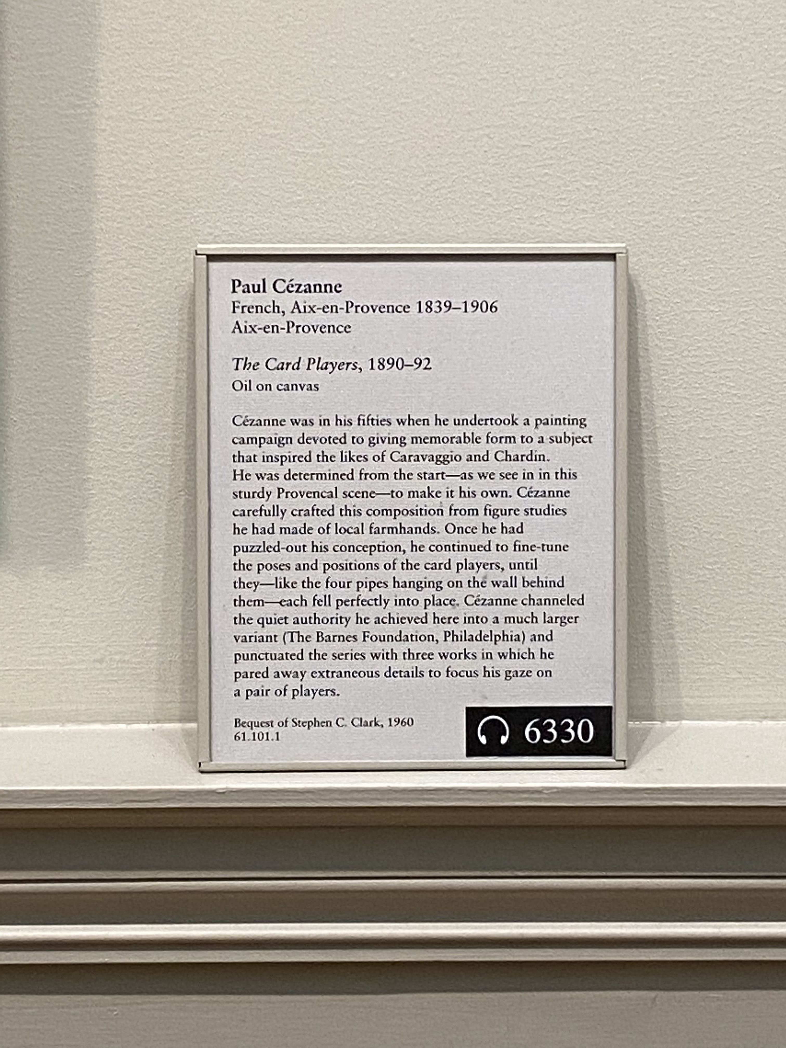 At The Met, the label for Paul Cezanne’s The Card Players contains a lengthy description relating to the creation of the painting and identifying other copies made by the artist (in this case, at the Barnes Foundation). Whereas at MoMA, the label for Georges-Pierre Seurat’s Evening, Honfleur states, “Explore how Seurat used dots of color to make this seascape.” The contemplative nature of these labels reverberates into the surrounding galleries.