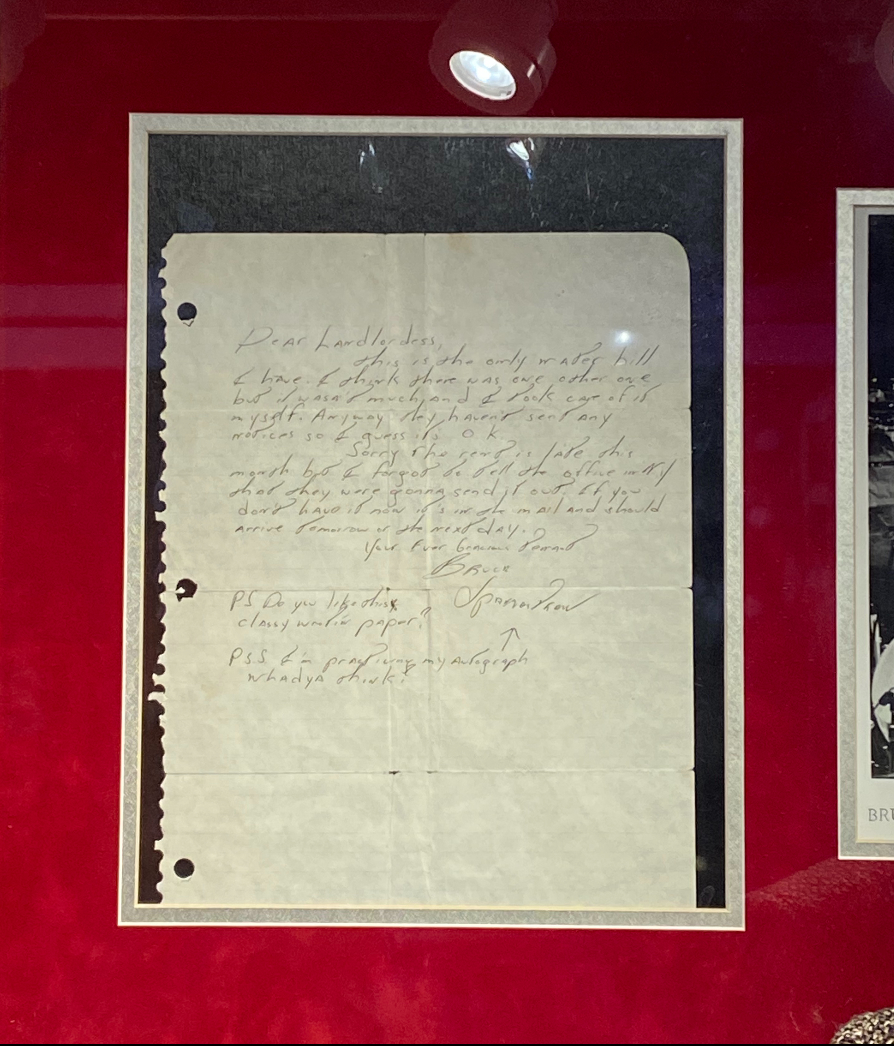 My favorite artifact from this exhibition was a humorous letter Springsteen penned to his “Landlordess” regarding a late rent payment. At the end, he signs the note with a “P.S.S. I’m practicing my autograph whadaya think?” This piece may get overlooked in the display case because it stands inches away from the Born to Run iconic Fender that graced the album cover of its era. However, I found it quite charming, because it humanizes the rockstar.