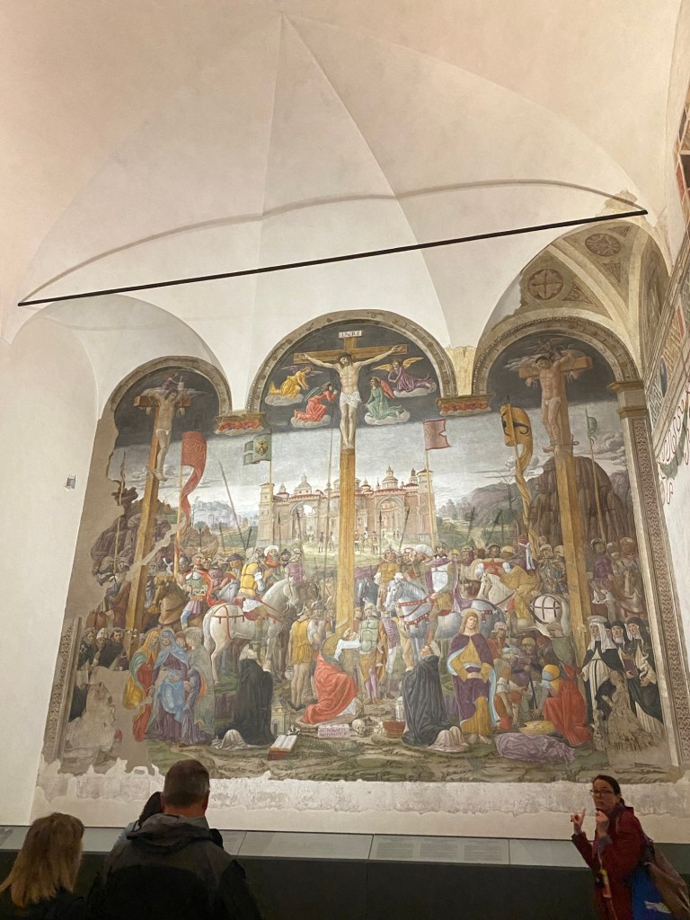 Viewing the Last Supper has always been on my Catholic bucket list – but I was blown away by seeing it in person. I almost felt guilty briefly gliding over to view Donato Montorfano’s Crucifixion. My main takeaway is I could not fathom how large it is! It consumes the north wall at 180 x 350 in. Additionally, it is not behind glass – meaning, viewers can get up close and personal with the work and do not have to worry about a glare. A thin, metal bar creates a border of separation between visitors and the work, but aside from that, guests have free roam in the space. I tried to take in each grouping of figures, spending a considerable amount of time with Judas, Peter and John. In this grouping, there are several key props, such as Peter’s sword, and Judas’s bag of silver that illuminate the drama of the scene. Additionally, pausing to look at Simon, located on the far right, who has suffered the most damage. His face is barely discernible on the wall due to the experimental technique and the bombing during World War II. The windows behind the figures act as a perspective device and add a layer of depth and brightness into the work.