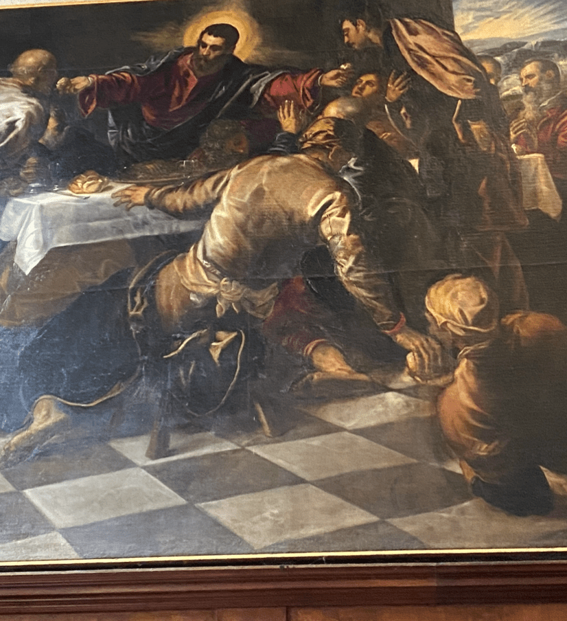 On this trip, I had the opportunity to view other Last Supper scenes, such as Jacopo Tintoretto’s (1518-1594) in the Church of San Polo. Tintoretto’s scenes are imbued with drama and animacy. Whereas Leonardo opted for a snapshot of stillness, the oil produced circa 1590 drastically shifts the viewer’s perspective and encapsulates the movement of the figures. Here, Christ stands up and thrusts his hands in between his Apostles. On the far left, Judas is seen with shoes, grabbing the pouch of silver and heading for the door. While both Leonardo and Tintoretto chose to portray the same event, these varying moments, arguably separated by seconds, enable a drastically different composition that is common in the Last Supper’s visual culture.