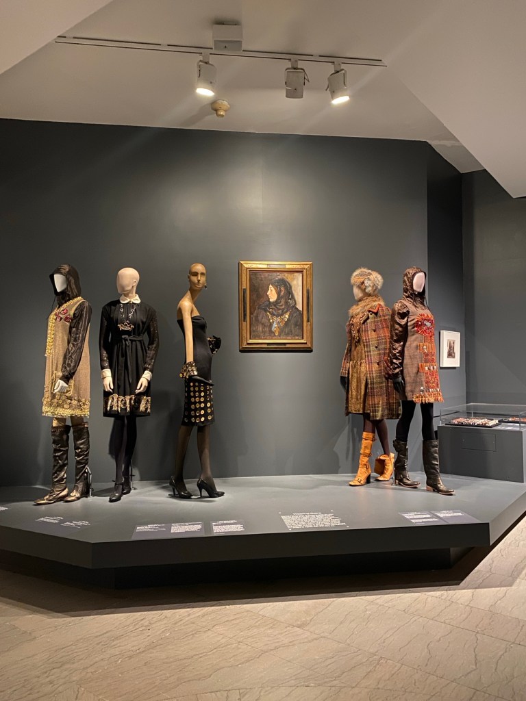As you walk into the circular, opening gallery, Elizabeth Taylor’s 1963 classic Cleopatra plays on a large screen. During my visit, the scene marking Cleopatra’s triumphant arrival in Rome was shown. Ancient Egyptian jewelry and fashion were on view in the display cases and mannequins saturated throughout the gallery. This entrance set the tone for the entire experience of the exhibition – sensory overload. The film, Cleopatra, spared no expense when it came to its costumes, set designs and displays (it cost $44 million dollars – the equivalent of over $426 million dollars today). Thus, illustrating the sheer decadence and decorative nature of gold. As you pass by the entrance text and into the main gallery, the visitor doesn’t know where to begin. Ultimately, I’m under the impression that was inherent in the exhibition designers’ goal, to highlight the glamor and multifaceted meanings behind gold, and to then carefully guide visitors through smaller, bite sized thematic displays.